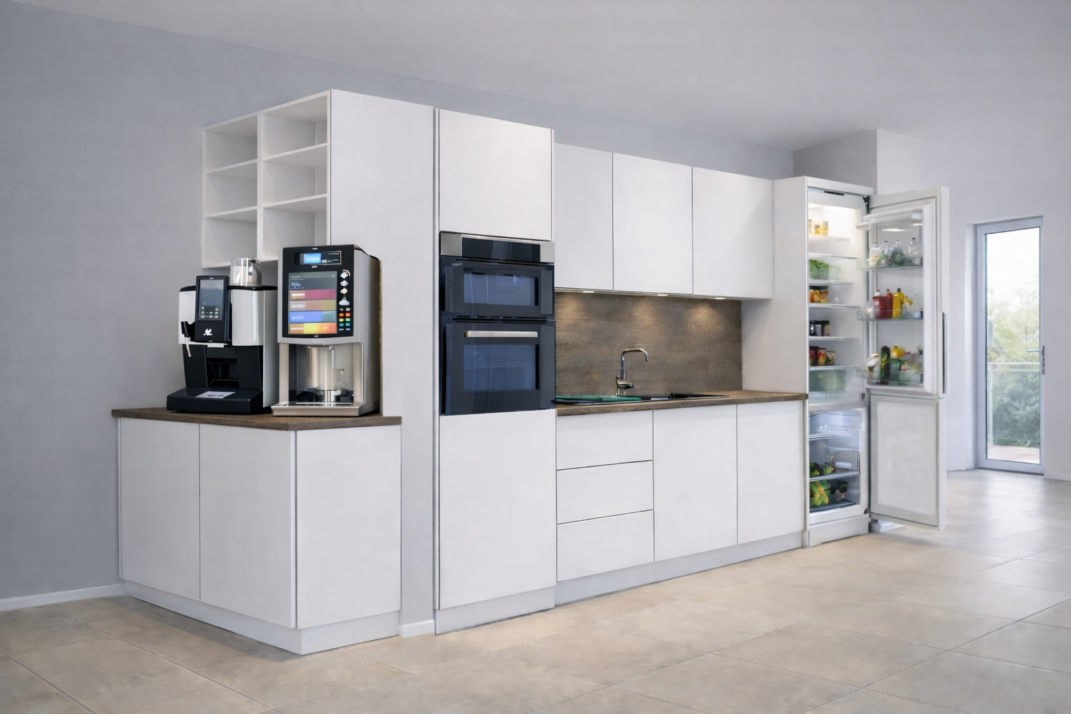 Dispensador de bebidas con 4 zumos (té helado, manzana, frambuesa-limón, flor de saúco) y agua, máquina de café con café, cacao, té, leche y azúcar (capuchino, café con leche, cacao, espresso, té, café negro largo, macchiato tardío)